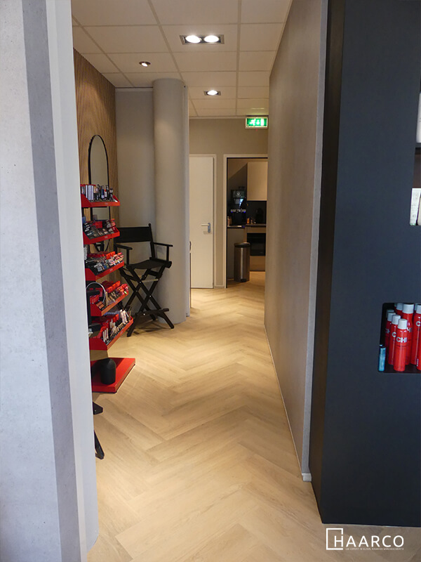 Wij mochten deze kapsalon voorzien van prachtige pvc-vloer van Ambiant in visgraat, kleur 1504. Ook de hoge witte plinten van 8cm zijn door ons geplaatst.
